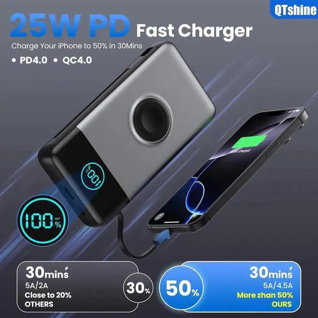 Watch/iPhone/Android: The portable iphone charger designed for Watch Series 9 / Ultra 2 / 8 / Ultra / 7 / 6 / SE / 5 / 4 / 3 / 2 All iPhone 16/15/14/13/12/11 Galaxy iPad Google Pixel tablets and more; Portable Charger for iPhone 40800mAh with Built-in 2 USB cables and iWatch Charger the AC Wall plug built in allows you to recharge itself directly. You don't need to carry adapter and cables everywhere any more. Easily track the status of your charge on LED Digital Display; The battery pack supports 25W PD fast phone charging allowing your iPhone 16 to fully charge 50% in 30 minutes nearly 3x faster than other traditional chargers. The USB-C cables works as input and output.