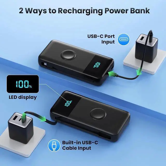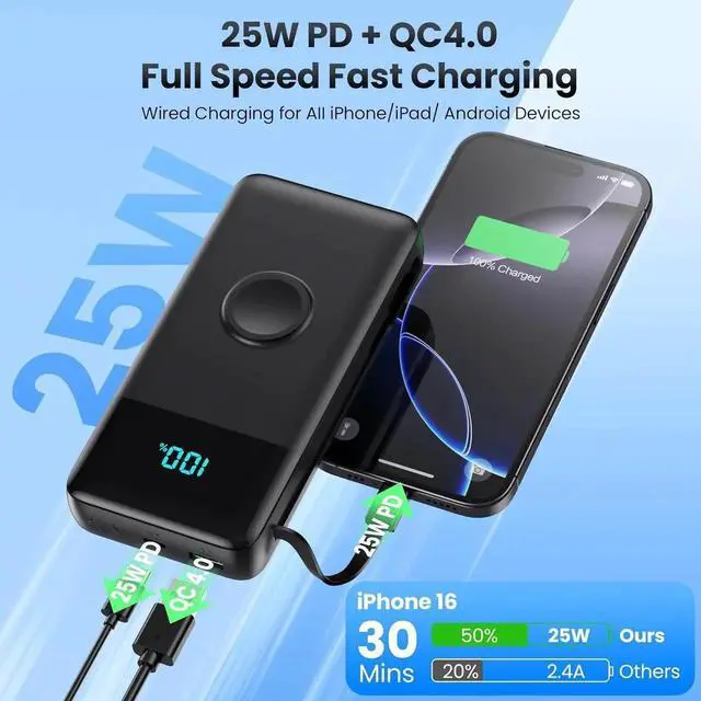 5-in-1 Portable chargerWith a total of 5 output ports (2 built-in cables 1 iWatch Charger 1 USB-A and 1 USB-C) this power bank can charge up to 5 devices simultaneously and recharge itself with 2 options (USB C cable USB C port) which is great for multi electronics users who has iPhone android or Watch and other usb devices. 25W PD USB C Power Bank Fast Charging The Portable Battery Pack equipped with 25W PD and QC 4.0 fast charging it can charge your iPhone from 0 to 50% in 30mins. nearly 3 times faster than standard chargers.