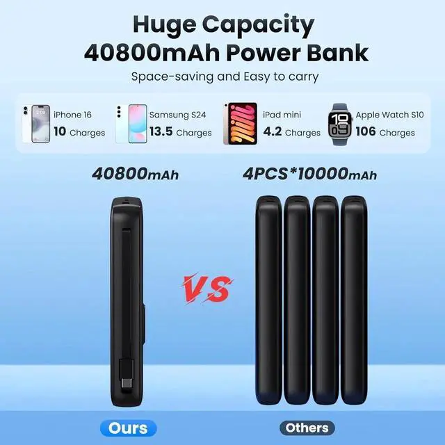 The power bank measures 5.8 x 2.75 x 1.06 inches and weighs 0.98 lb( 15.76 oz) featuring a large-capacity design. Portable Power Bank with Built-In Cables& iWatch chargerThis 40800mAh power bank with built in 2 cables (Type-C ios ) and magnetic wireless charger for iWatch Widely compatible with iPhone 16/15/14/13/12/ 11/XS /XR/ SE Pro /Pro Max S24/S23 Series Google Pixel LG Moto tablets Android devices Watch Ultra 2/Ultra/10/9/8/7/6/SE/5/4/3/2 AirPods and more.