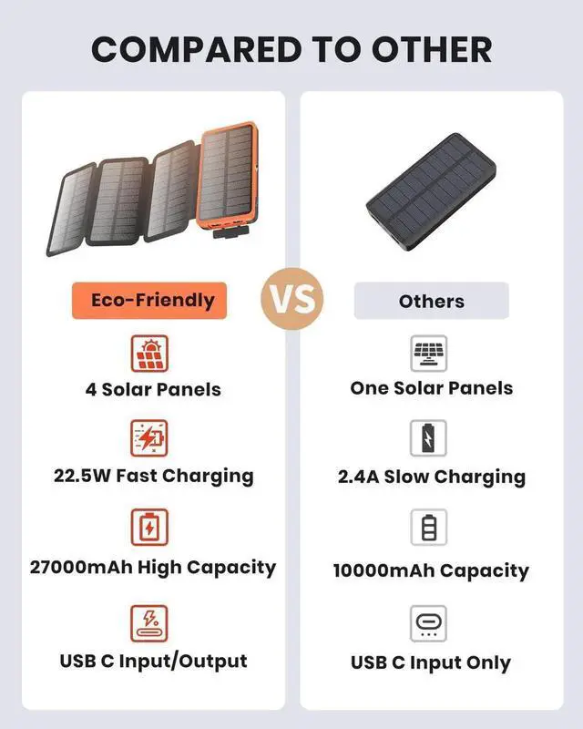 Power for Days: The solar charger boasts a massive 27000mAh capacity allowing you to charge an iPhone 8 times or a tablet 3.5 times before needing to recharge the power bank itself.