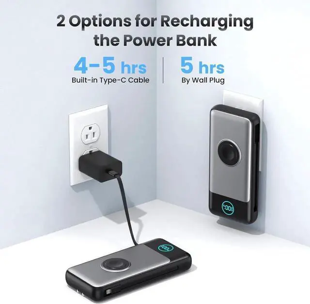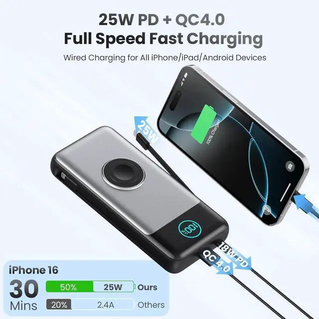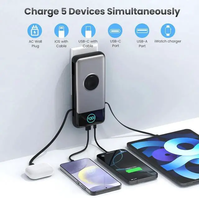Great battery pack for your family and friends camping hiking and traveling. LED digital screen shows the battery power even accurately to 1%. no more guessing whether need to charge it or not. Fast Charging 5 Devices Simultaneously This portable charger with built-in cords both an android or ios phone fast charging 5 devices simultaneously. Support iPhone fast charging + max 3W iWatch wireless fast charging + max 18W QC 4.0 USB-A output + max 25W PD USB-C output and max 18W USB-C input. the USB C cable supports PD25W it can charge your iPhone from 0 to 50% in 30mins.