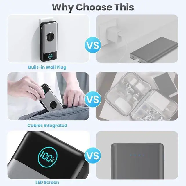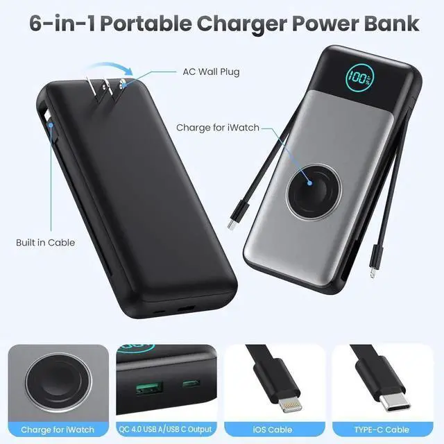 Wide CompatibilityThis 26800mAh portable charger with built in 2 cables(Type-C ios) and magnetic wireless charger for iWatch Widely compatible with iPhone16/15/14/ 13/12/11/XS/XR/SE Pro/Pro Max S24 /S23 Series Google Pixel LG Moto tablets Android devices Watch Ultra 2/Ultra/10/9/8/7/6/SE /5/4 /3/2 AirPods and more. Portable Charger with Built-in Cables & AC Wall PlugFeob Portable Charger with built-in USB-C cable other cable for iPhone and AC Wall Plug for recharging the power bank itself but also is equipped with USB-C and USB-A output. You can say goodbye to carrying adapters and cables when travel. High-Capacity Portable ChargerWith a 26800mAh huge battery capacity it could charge your phone about 5-6 times Which can keep your phone always on.
