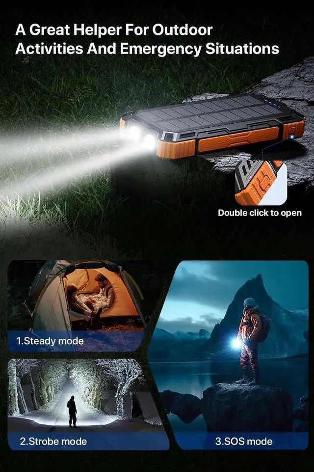 OUTDOOR DESIGNMade from high-strength ABS and PC materials this power bank is IP65 waterproof heat-resistant shockproof and dustproof. The ultra-dense fine-grained non-slip design provides a comfortable grip for a better user experience. INTELLIGENCE SAFETY PROTECTION SYSTEMSolar battery bank has built-in multiple intelligent security protection systems to keep your device away from overcharge over-current over-voltage overload short circuits etc.