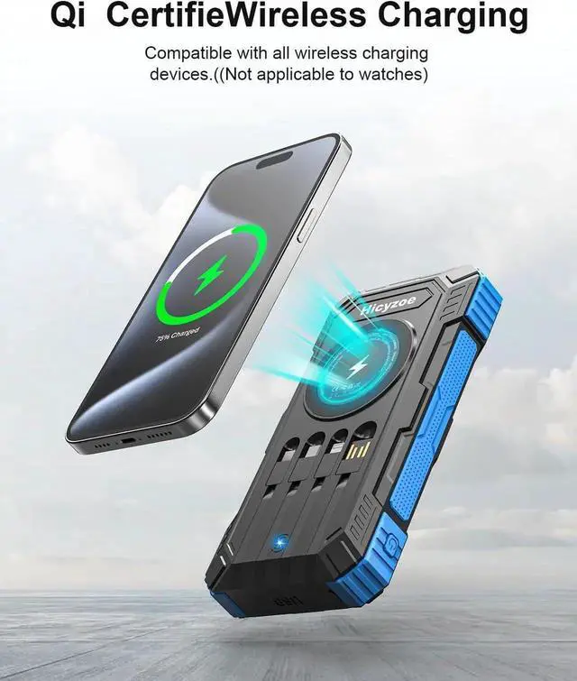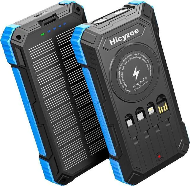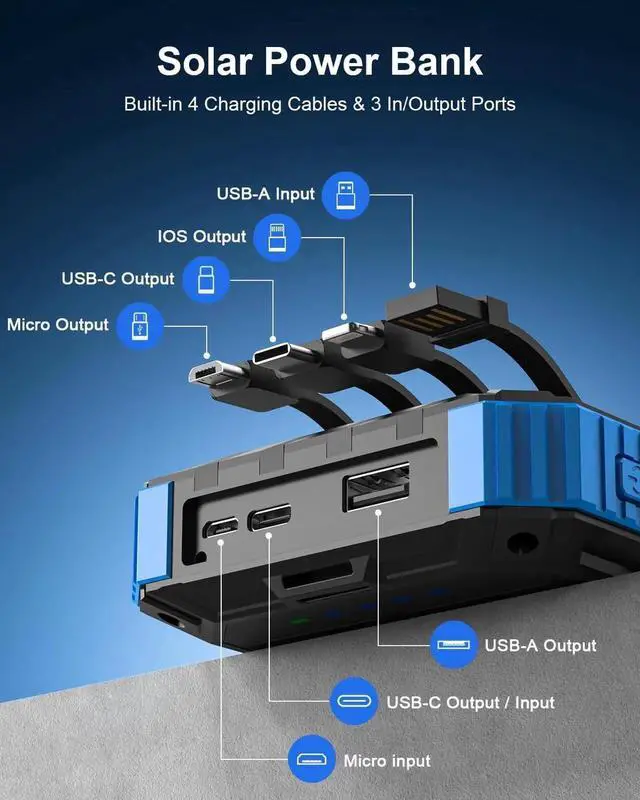 Huge 49800mAh CapacityThis solar power bank comes with a 49800mAh high - quality high - density lithium-polymer battery. It has a long lifespan and can be recharged numerous times so power outages won't worry you. The intelligent protection IC chip offers temperature over-voltage over-current and short-circuit protection for safe charging. Wireless Charging & High CompatibilityThe solar charger also a wireless charger supports wireless charging. It's compatible with all wireless-charging-enabled devices like iPhone 16/15/14/13/12 series and Galaxy S24/S23/S22/S21 series series LG series etc.. Just place your device on it to charge. Charge Up to 6 Devices SimultaneouslyEquipped with 4 ports (Type-C *1 Lightning *1 and Micro USB *1) and 1 USB-A input cable this portable charger for multiple devices can provide high speed charging.