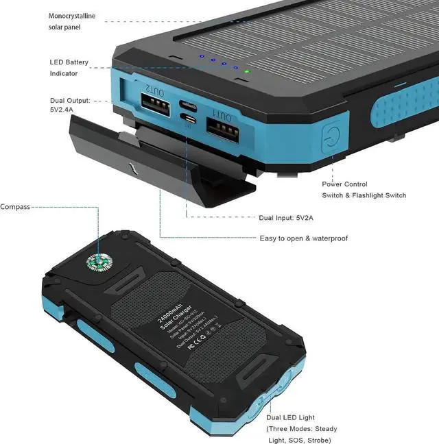 Huge Capacity: With solar charging function you don't need to worry about running out of power. Built-in high-quality 24000mAh lithium polymer battery pack. It adds 7.5 times for Phone 3+ times for camera.?? Dual 2A Inputs & 2.4A