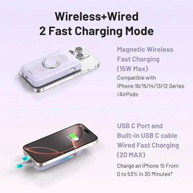 Built-in Cables: The magnetic portable charger features two built-in charging cables (USB-C and iOS) and can power up to 5 devices simultaneously. It supports maximum wireless fast charging of 7.5W 10W and 15W with a maximum of 20W for USB PD and 20W for USB-C input/output. Once connected it automatically switches to the optimal charging mode simplifying your charging process with this all-in-one magnetic wireless power bank.