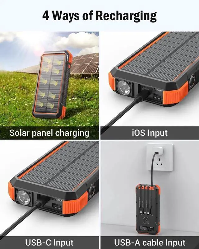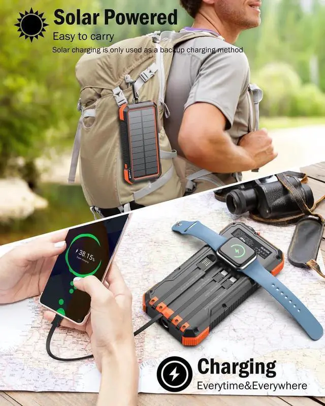 Charging Ways: The portable charger comes with 4 built-in cables (Type C*2 and iOS*1 and 1 USB-A input cable) and 4 charging ports (two-way USB-C 2*USB-A and iOS) supporting charging up to 7 devices at the same time. No need to carry output and input charging cables. Get rid of messy cables and charge anytime anywhere. Large Battery Capacity & Fast Charging: The solar battery bank with a large battery capacity of 20000mAh. It can provide multiple charges for various devices such as it can provide approximately 4.2 charges for iPhone 15 3.6 charges for Galaxy S23 2.7 charges for iPad Mini 6 2.3 charges for MacBook Pro 14 and a whopping 45 charges for Watch 9. The USB-C port also supports 20W fast charging amazing charging speed is triple as fast as ordinary portable chargers and zero damage to your devices.