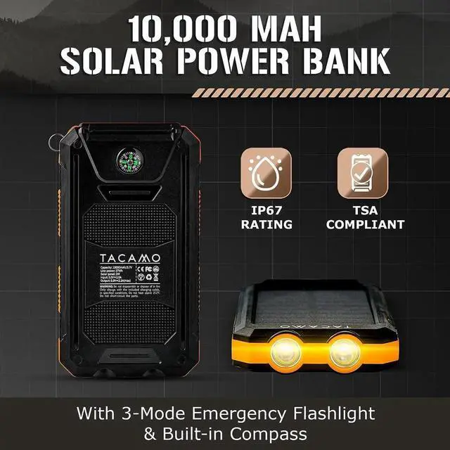 Charge Devices Off the Grid - Keep your tech arsenal ready for action with the TACAMO Solar Power Bank portable charger battery pack. Featuring dual USB 5V 1A/2A outputs it is compatible with Android iPhone iPad and other USB-rechargeable devices. Never Leave Home Without It - Waterproof dustproof and TSA compliant this portable solar power bank is the perfect carry-on companion. Enjoy reliable backup power while camping backpacking on the road or up in the air. Be Ready for Emergencies - If youre looking for the best solar power bank portable charger weve got you covered.