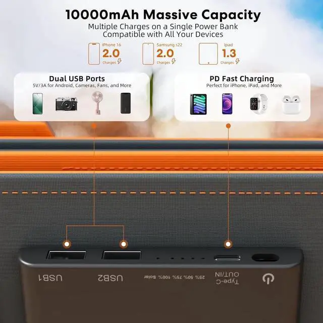 30W Solar Charging with Multiple Charging Methods Equipped with three foldable solar panels and a 10000mAh high-capacity battery it charges faster than single-panel models. In sufficient sunlight it can fully charge in 2 hours and charge an iPhone 16 from 0% to 60% in 30 minutes. Ideal for outdoor adventures camping and hikingWide Compatibility Multi-Device ChargingCombines QC 4.0 and PD 3.0 fast-charging technologies for higher efficiency. Features triple output ports (2 USB 1 Type-C) allowing simultaneous charging for 3 devices. Compatible with iPhone iPad tablets and more. Can fully charge an iPhone 16 twice and an iPad Pro 1.2 timesFoldable and Portable Design IPX5 Water and Dust ResistanceLightweight and foldable design (folded size: 11×6×