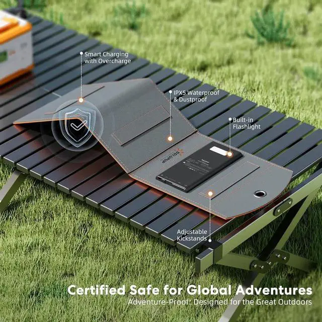 1.4 inches weight: 2.4 lbs) compact as a book easily fits into a backpack. IPX5-rated water and dust resistance durable ETFE-laminated solar panels built-in storage bag and external hook for hanging on backpacks tents or trees. Perfect for outdoor activitiesBuilt-in LED Flashlight and Smart Safety ProtectionFeatures a high-brightness LED flashlight for night-time or emergency use. Equipped with smart IC chip technology for overcharge overvoltage and overcurrent protection ensuring safe use. Made of flame-retardant ABS and high-quality PC materials heat and wear-resistant reliable performanceComplete Packaging and Reliable After-Sales SupportPackage includes 1 solar power bank 2 buckles 1 charging cable and 1 user manual. SOLUPUP offers 7*24 customer service to ensure your satisfaction.