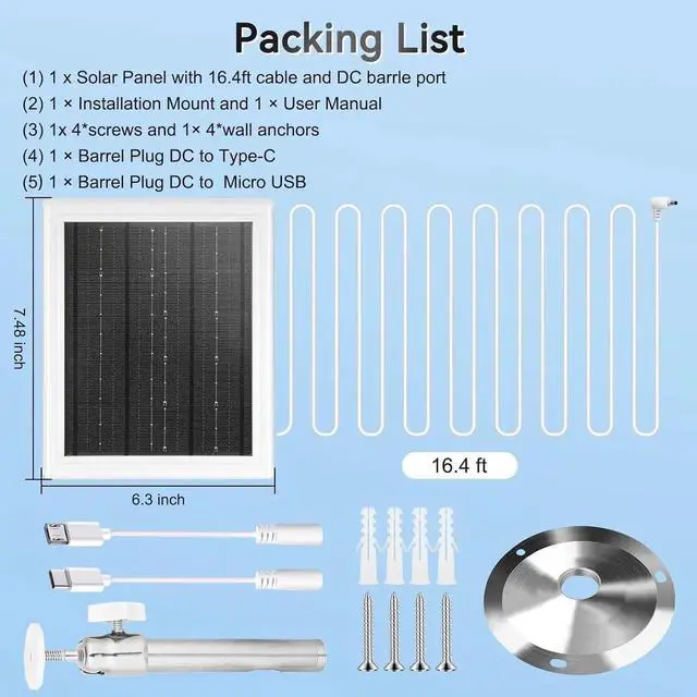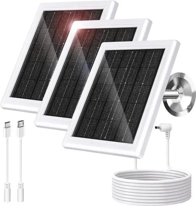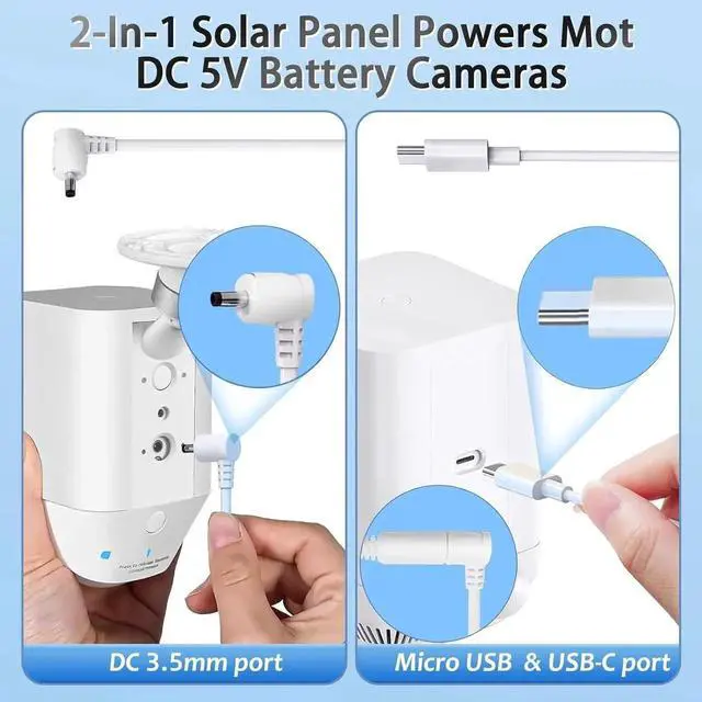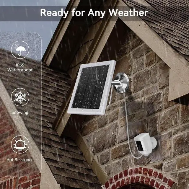 Strong Compatibility--This Solar Panels Charger within 3 different cable ports type-C micro-usb and DC 3.5MM port not only compatible for Ring Spotlight Cam and Stick Up Cam as well as compatible for other outdoor Wireless Security Camera24 hours Non-stop Charging --5W Outdoor Ring camera solar panel surface is made of monocrystalline silicon material IP65 waterproof dustproof low and high temperature proof. A few hours of direct sunlight every day would keep your wireless ring surveillance charged continuous. Flexible Mount--Solar Panel Charger With a mount that rotates 360 degrees giving you the freedom to choose install and position your solar panel in full sunlight.