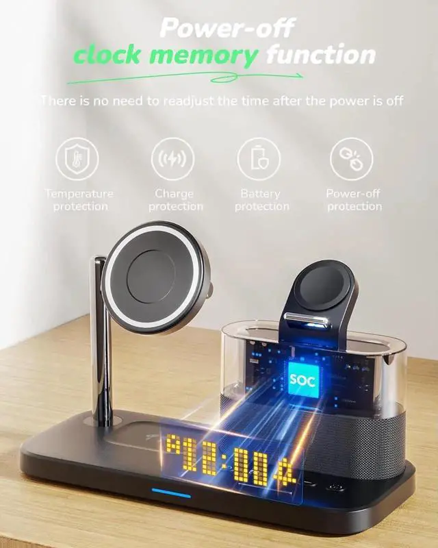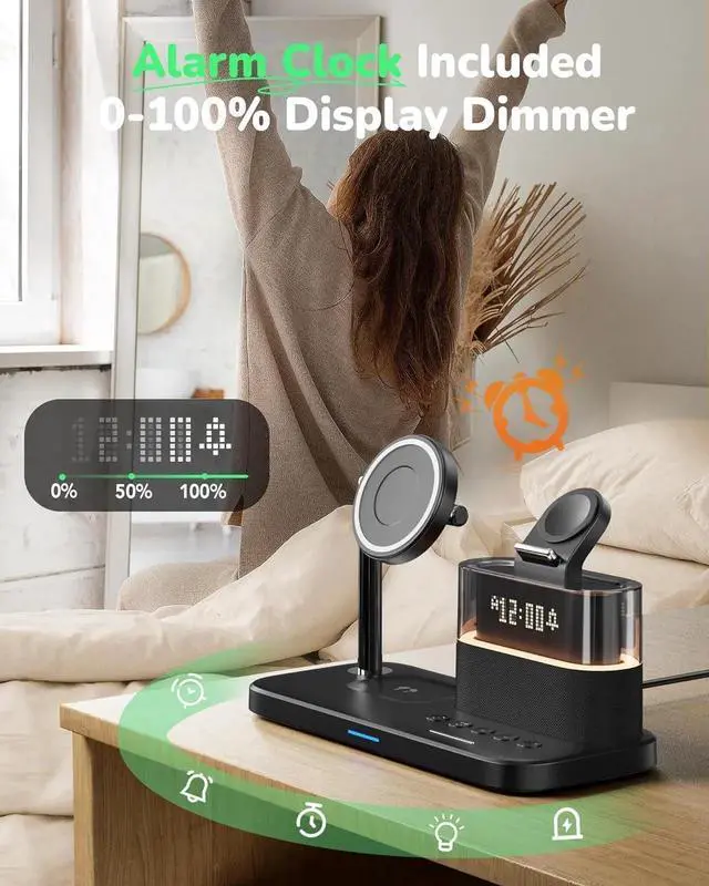 Universal CompatibilitySimplify your charging setup with this upgraded magnetic wireless charging station compatible with iPhone 17/17 Air/17 Pro/17 Pro Max/16 15 14 13 12 Plus/Pro/Pro Max/Mini Watch Series 11/Ultra 3/SE 3/10/Ultra 2/Ultra/9/8/7/6/5/4/3/2/SE/SE 2 (Not for others smart watches) Air-Pods Pro 3/4/3/2/Pro Mag-Safe Version. Please check and make sure the specific series is compatible withe wireless charging. 5 in 1 Wireless Charging StationiPhone charging station with clock you can have magnetic phone holder iphone charger watch and air-pods charger a digital alarm clock and a cool bedside night light. A magnetic wireless charging station is enough for your ecosystem away from messy tangled cables.