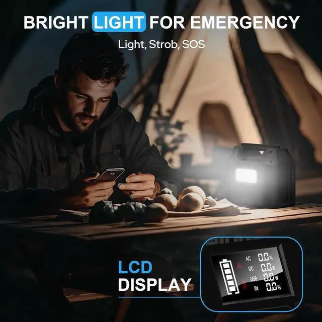 12V car port about 5-6hrs (cable included) or 13-23V solar panel about 4-6hrs full sun (solar panel NOT included) to become a small solar generator ideal for off-grid camping home backup or emergency preparedness. Lightweight & Rugged for Outdoor Adventure This portable charger power bank weights just 4 lbs with a compact size of 7.5 x 4.5 x 6.5 making it easy to carry for hiking RV trips festivals or emergency kits. Camping Essentials with Emergency LED LightThis battery powered generator is built with a 3-mode LED flashlight steady strobe and SOS to meet your different needs very useful and handy for a dark night both indoors and outdoors.