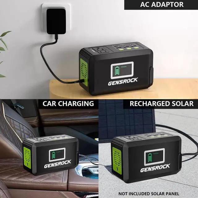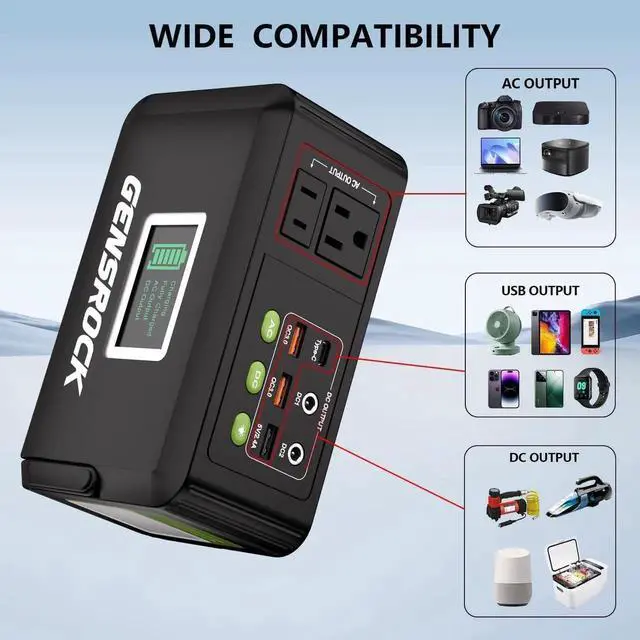 Easy To Carry: With a super slim size of 6.6 x 4 x 3 inches and a lightweight of just 2.3 lbs this portable power station is easy to carry and ideal for travel business trips or outdoor adventures. It serves as a reliable backup battery power supply providing enough energy to charge most of your essential devices including smartphones tablets and laptops. Whether you're on the go or need a backup power source this compact unit ensures you stay connected wherever you are. Safety Protection SystemGensrock portable power station has a built-in lithium-ion battery and a safe design-protected battery management system (BMS) to prevent battery pack overcharge over-discharge short circuit overvoltage overcurrent and automatically triggers intelligent thermal control through the cooling fan to protect your cell phone and other devices in all aspects and extend battery life. Cycle life >1500 times. Three Recharging ModesThe camping power bank with AC outlet supports charging via AC outlet solar panel (not included) or car outlet and can be used while charging. Its digital screen displays real-time energy levels and status. With 24000mAh capacity its perfect for outdoor activities like camping ensuring reliable power for your devices. Emergency LightsThis portable charging bank has 2 built-in lighting modes (always on SOS mode) to help you use it during camping and home power outages making it the best choice for home emergency power.