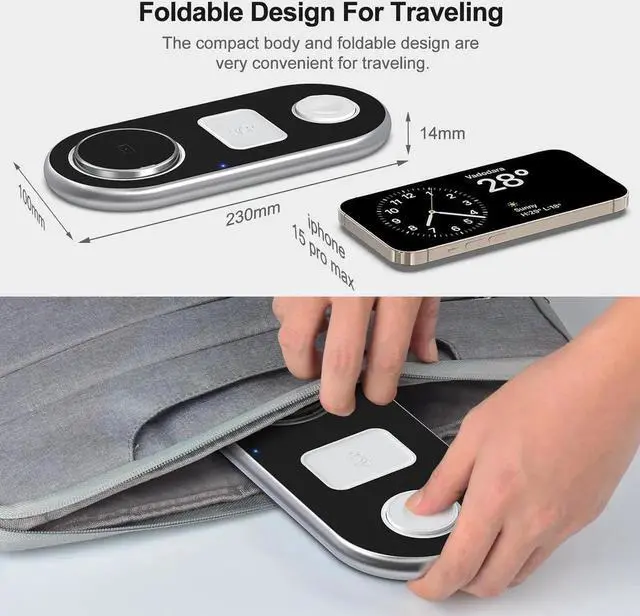 FOLDABLE PORTABLE MAGNETIC CHARGING CRADLE: Our wireless charging pads for iPhone and Watch are foldable and compact making them extremely convenient for traveling. Pull the panel of the iPhone magnetic charging pad up from its raised position to angle the panel approximately 170°. Snap up the Watch charger section by hand until it is vertical. 2 angles are adjustable. 3 In 1