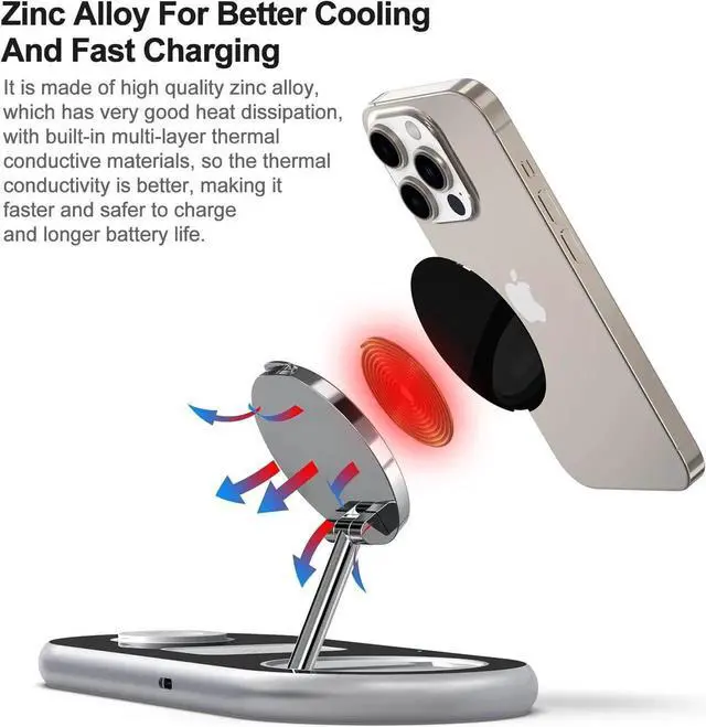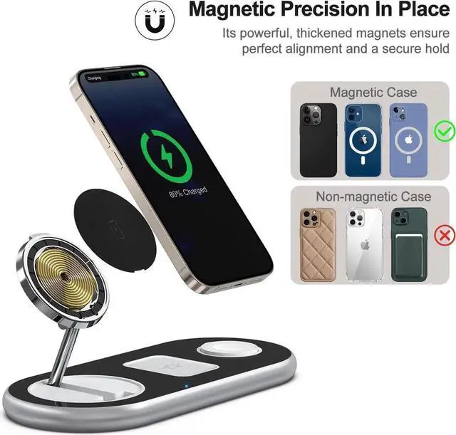 POWERFUL MAGNETIC CONNECTION: OKFLYMAN wireless charger base with MagSafe technology ensures that your iPhone and Watch are perfectly aligned and won't cause your device to fall off! 180°adjustable viewing angle 360°vertical or horizontal charging convenient for watching videos and checking incoming call information. Anti-slip design on the bottom makes charging safer and more reliable.