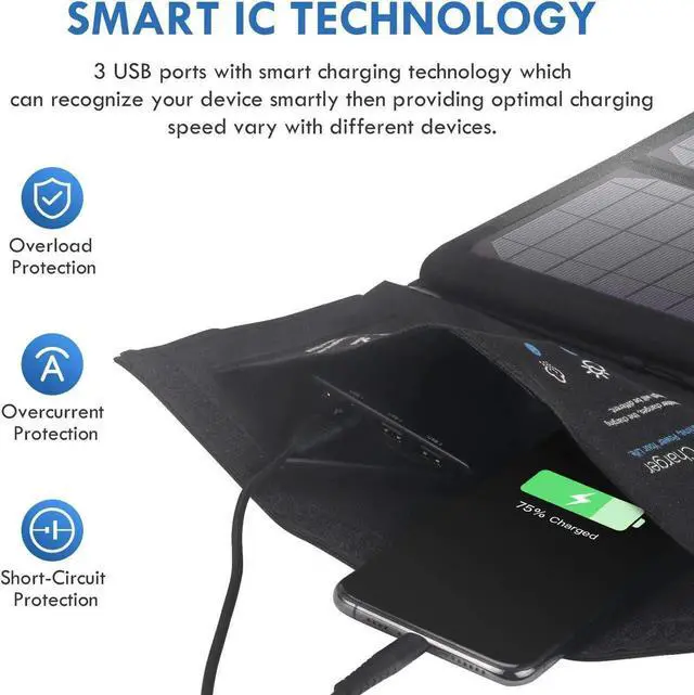 Upgraded Triple USB Ports: This 28W solar panel charger has 3 USB-A ports(each 5V/ 2.4A Max) with smart charging technology that recognizes your device smartly and provides optimal charging speed which varies with different devices. CE/ FCC/ RoHS certificated BigBlue solar phone charger ensures 100% safe charging with overcharging overheating and short circuit protection.