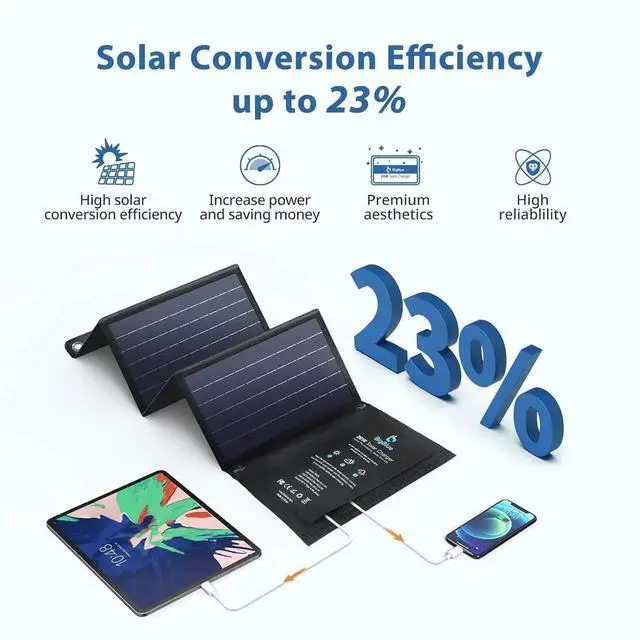 High Energy Conversion: A highly efficient folding solar panel can convert up to 23% of solar power into free energy under enough sunlight. Its special PET polymer surface protects it from occasional rain or wet fog all the ports are covered by rubber cover to protect them from dust or water damage.