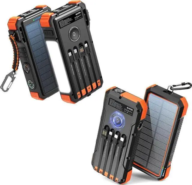 Devices: The BLAVOR solar charger is your ultimate charging solution! With its 4 built-in cables (including 2 USB-C 1 iOS and 1 USB-A) and 3 charging ports (USB-C USB-A and iOS) you can power up to 6 devices all at once. It even has a special wireless charging area for your Watch making it a true multitasking marvelHigh Battery Capacity and