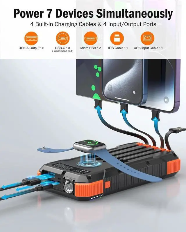 Watch Charging: The wireless watch charging function of this solar power bank is compatible with Watch series 9/8/7/6/SE/5/4. Place your device in the wireless charging area and you can charge it immediately. Make your charging method more convenient. Built-in 4 Cables 7