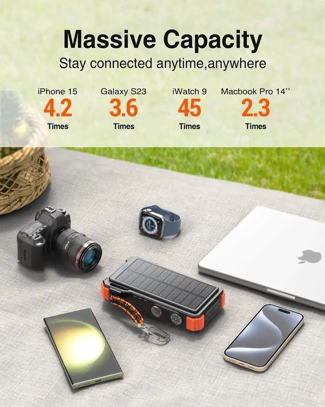Fast Charging: Say goodbye to low battery anxiety! The BLAVOR solar power bank packs a whopping 20000mAh battery capacity providing multiple charges for your devices. Imagine getting approximately 4.2 charges for your iPhone 15 3.6 charges for the Galaxy S23 2.7 charges for the iPad Mini 6 2.3 charges for the MacBook Pro 14'' and an incredible 45 charges for your Watch 9! Plus the USB-C port supports 20W fast charging so you can fully charge your iPhone 157 Ingenious