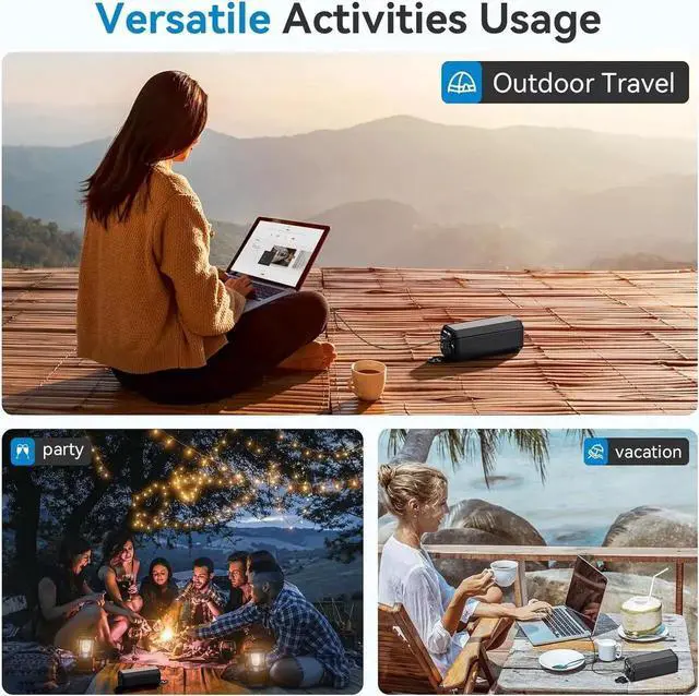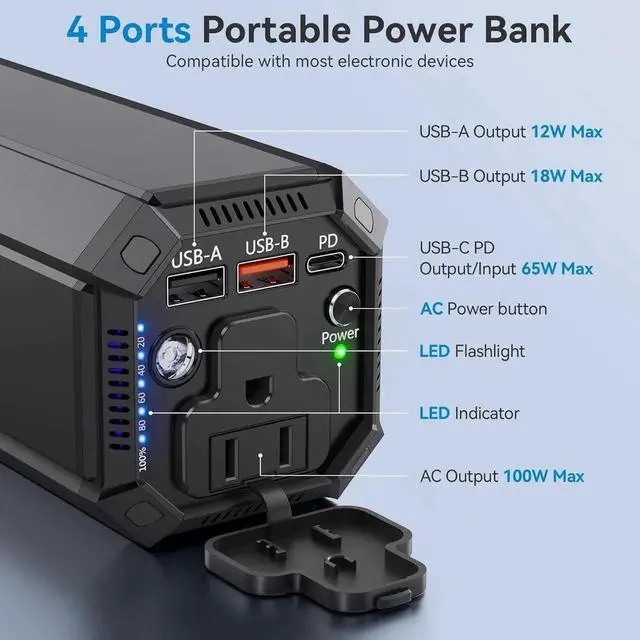 Power Bank: The AC outlet up to 100W which can meet the charging and on-load needs of electrical appliances less than 100W. Don't worry about wall plugs limiting your power needs charge your device anytime anywhere. it is an ideal necessity for outdoor activities hurricanes and home emergency power outage. 65W PD