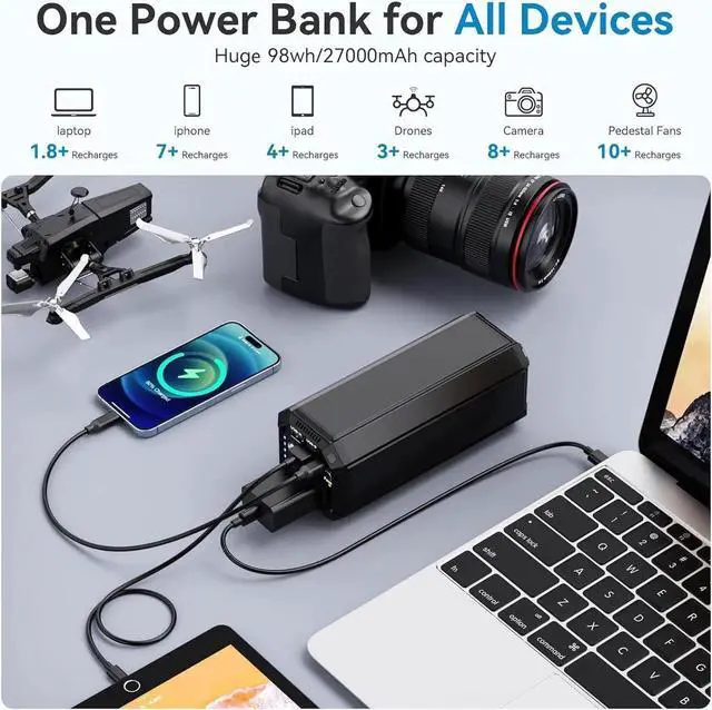 Huge 27000mAh Capacity: This power bank has a capacity of 27000mAh and four output ports for your emergency needs. There's a 100W AC port a 65W PD Type-C port a 12W USB port and an 18W USB port for all your charging needs. You can charge your laptop phone tablet camera etc.