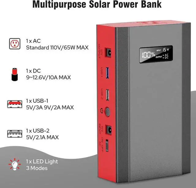 Solar Panel: With a 24000mAh lithium-ion battery pack the portable power bank is powerful enough to charge plenty of smart electronics such as laptops phones tablets cameras drones fans etc (AC output 65W max) As a solar power bank kit you can store solar energy through this device(Tips: AC output needs to be turned on or off manually. If DC output is only turned on and no loads are connected the portable power bank will be turned off within 20 seconds)?? Portable Battery Pack with