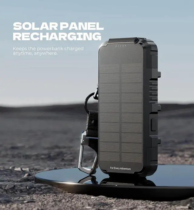 & QC 3.0 fast charging: Power up faster than ever with these fast-charging ports: 65W PD 3.0 Type-C1 20W PD 3.0 Type-C2 and 18W QC 3.0 USB-A; This solar power bank charges your iPhone 16 to 55% in just 30 minutesperfect for travelers and adventurer enthusiasts who needs quick top-ups on the go. Strong magnets for easy wireless charging: Say goodbye to cable clutter and alignment hassles; This powerbank features strong magnets for effortless wireless attachment delivering 15W of power for Android devices and 7.5W for iOS fully compatible with MagSafe Qi and other wireless charging standards.
