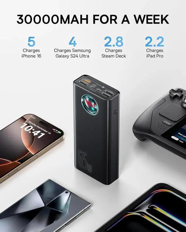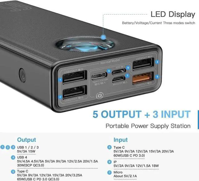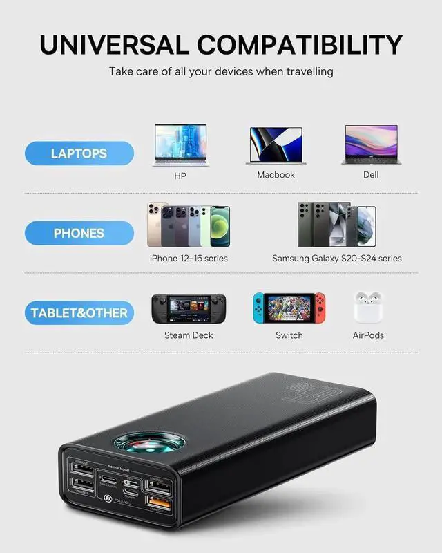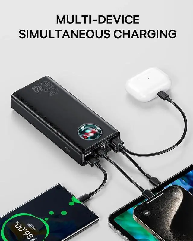 NOTE: It's a must-have for outdoor activities business trips and power outage emergencies high capacity so the product is a little bulky. 65W Ultra-Fast ChargingCharge your MacBook Pro 13 0-50% in 56 mins with 65W PD fast charging - faster than most laptop power banks. Includes 100W USB-C to C cable for instant use. This is an ideal portable charger for business travelers who need to charge their laptops iPads and phones quickly. 5-Output+3-InputPower 5 devices at once (4 USB-A + 1 USB-C port) while recharging itself via 60W PD input (full recharge in 2.5 h). Smart power allocation automatically optimizes charging speed for each connected device - perfect for families/teams sharing one power source during trips or outages. Widely Compatible This 65W power bank is equipped with a smart digital display that supports three modes and provides real-time monitoring of current voltage and power. It reminds you of the charging status and is compatible with almost all USB-C and USB-A powered devices. It supports PD 3.0 QC 4.0 and SCP for fast charging of your MacBook Pro XPS iPhone 15 14 13 12 11 SE XS iPad Pro Galaxy S10 Google Pixel and more.