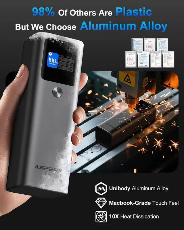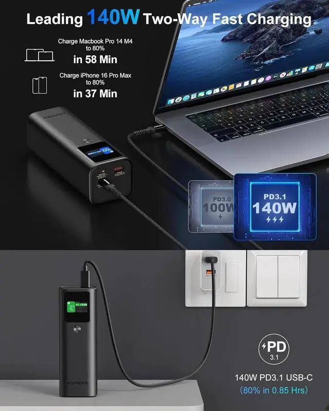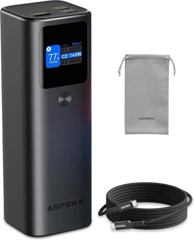 All-Day Battery Life: Charge your laptop phone and devices for 24+ hoursideal for work hikes or cross-country flights. 162.5?????????????????????????????????????? -??????????????: AsperX portable charger power bank adopts the latest chip solution which can provide 162.5W charging speed and the maximum single port can reach 140W. AsperX laptop power bank can provide 65W and 65W for two computers at the same time. It can significantly improve the charging efficiency and feel the speed of technology.???????????????????????????????????????????????? -??????????: AsperX stands among the elite 1% of brands using genuine aviation-grade aluminum alloy casing not cheap plastic with metallic paint. Experience the difference with our military-grade metal shell that delivers luxury tactile 40% heat dissipation than plastic alternatives extended battery lifespan for both your devices and power bank plus consistently stable fast charging - all engineered to protect your valuable gadgets while looking exceptionally sleek.???????? -????????????????????????????: AsperX power bank for laptops features the largest colorful display currently available. Real-time display of battery level remaining time output/input power battery information let you feel the charm of technology at all times. Adjustable screen brightness let you have the best experience indoors and outdoors. 24-?????????????????????????????????????????????? &??????????????????????????????????????: Enjoy peace of mind with our industry-leading 24-Month comprehensive protection covering defects in materials & workmanship.