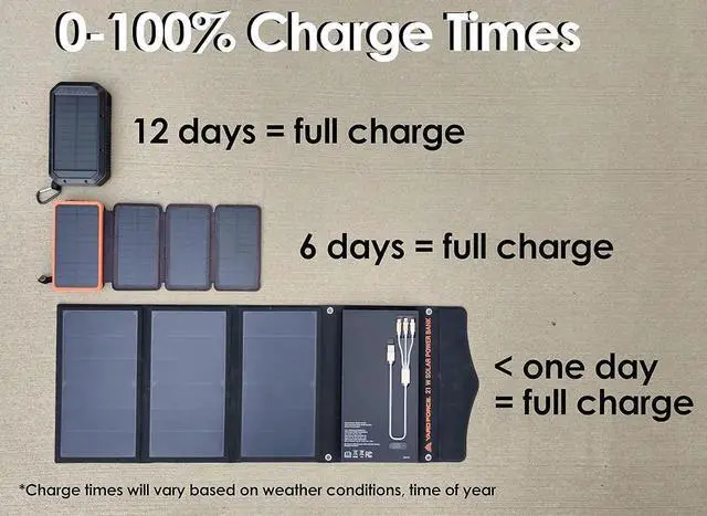 Built-in 1* QC 3.0 USB-A max 18W 1*PD 2.0 USB-C max 18w 1* 3 in 1 charging cable. [13000 mAh Battery in-built] - The markets one and only solar power bank that use more than 21w solar panel. Enjoy the days worth of charging capacity enough to top up iPhone 15 3 times S22 2 times or 13 times. [4 Hours 80% Recharge] - Only need 6 - 10 hours to fully recharge the 13000mAh battery in good sunshine condition while other solar power banks need 4 days! We are the fastest-charging solar power bank on the market.