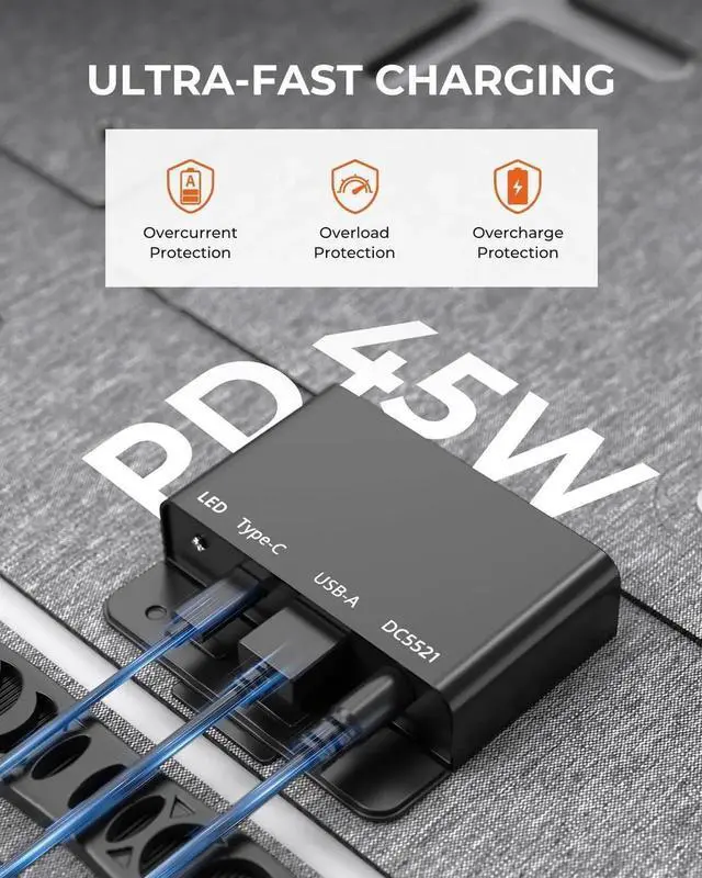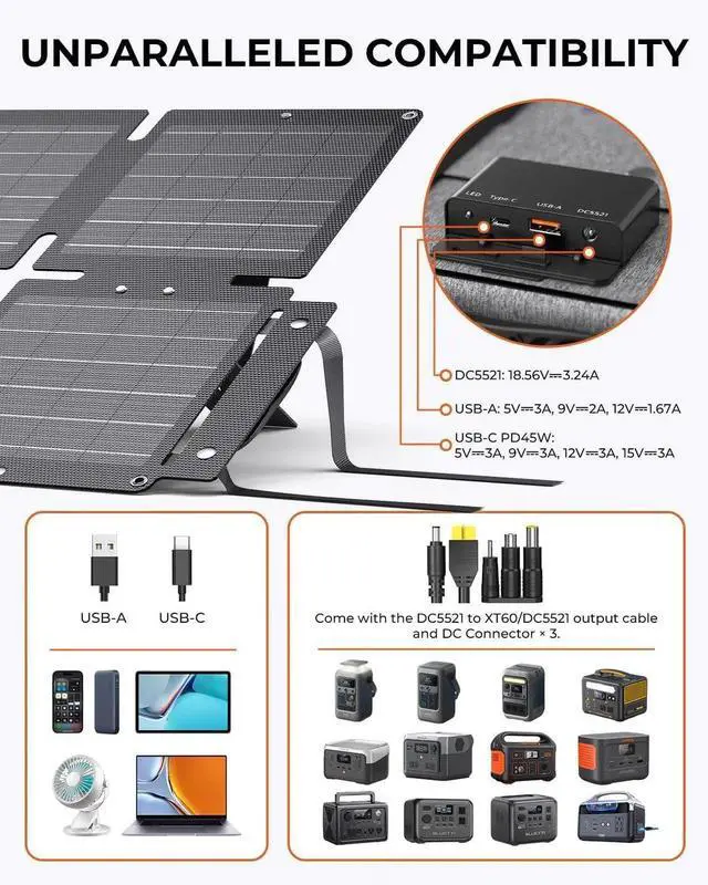 HIGH SAFETY AND COMPATIBILITY: This portable solar panel incorporates a DC 5521 port and includes a DC5521 to XT60/DC5521 cable along with diverse adapters ( DC5521 to DC7909 DC8020 DC35135) ensuring compatibility with most small portable power stations. Built with advanced safety features such as overcharge short-circuit and temperature protection it guarantees safe stable and efficient performanceRAPID