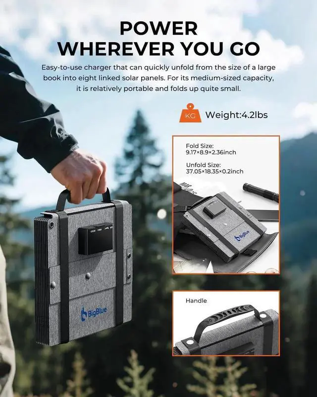 N-TYPE EFFICIENCY DOMINANCE: BigBlue X60 solar charger adopts advanced N-type solar cells achieving an impressive 24.7 % solar conversion efficiency. It offers improved efficiency reduced deterioration a low-temperature coefficient and superior performance in low-light conditions compared to conal solar panel charger. Integrated kickstands enable precise sun-angle optimization for peak power generation.