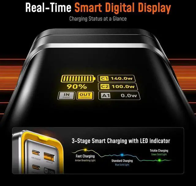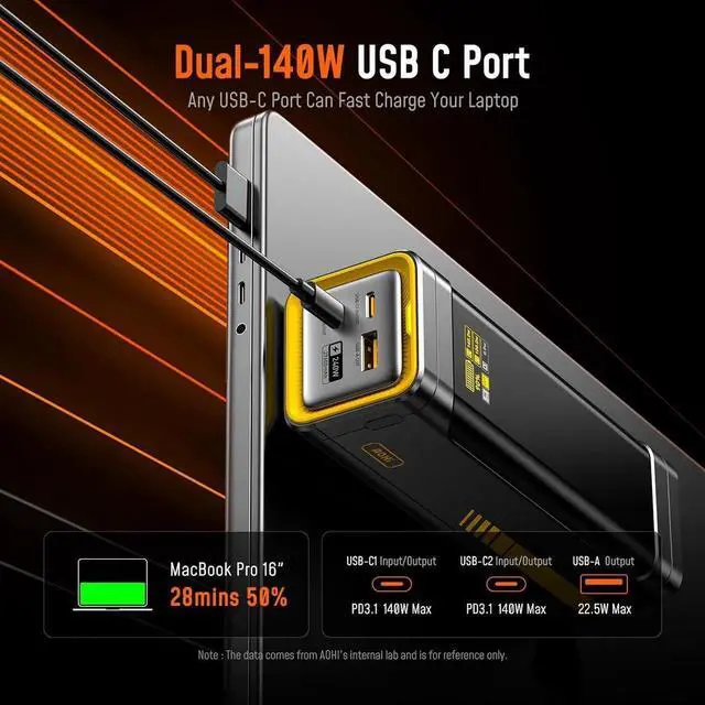 Output Power Everything Anywhere: Equipped with cutting-edge PD 3.1 fast charging technology This AOHI the Future Starship power bank delivers an impressive 240W total output featuring dual USB-C ports with up to 140W max output and an additional USB-A port with up to 22.5W max output. This portable power bank can charge two laptops at oncewhen USB-C 1 delivers 140W USB-C 2 can provide up to 100W max. If you need a quick boost for your device this battery pack can power up a 16 MacBook Pro from 0% to 50% in just 28 minutes keeping your workflow and entertainment uninterrupted. Whether you're working traveling or gaming this is the ultimate charging companion140W