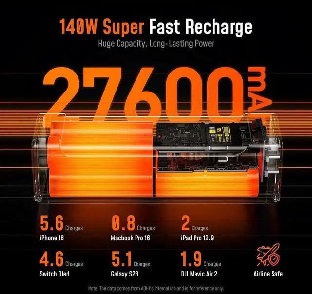 Power That Lasts: With a massive 27 600mAh capacity the AOHI Future Starship power bank can recharge an iPhone 16 up to 5.6 times or a 12.9 iPad Pro about twice or a MacBook Pro 16 approximately one times ensuring your devices stay powered during long trips and heavy use. Plus with a 99.36W h rating it complies with TSA regulations (<100Wh) making it safe for carry-on luggage when traveling by air. This high-capacity power bank provides reliable power for a variety of devices ensuring youre never caught without backup when you need it most240W Total