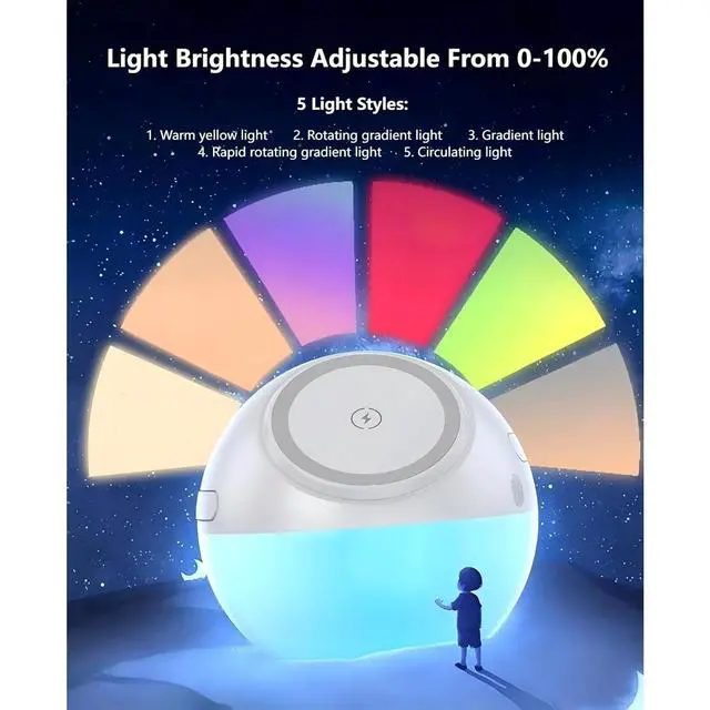 Touch-control Night Light: This wireless charger features a customizable night light. Customize your space with adjustable Warm yellow light/Rotating gradient light/Gradient light/Rapid rotating gradient light/Circulating light. Light Brightness Adjustable Warm yellow light offering brightness levels (0%-100%) Long press to adjust brightness.- perfect for creating the right ambiance in your domestic use areas.For alarm settings, please see the tutorial on the product details page