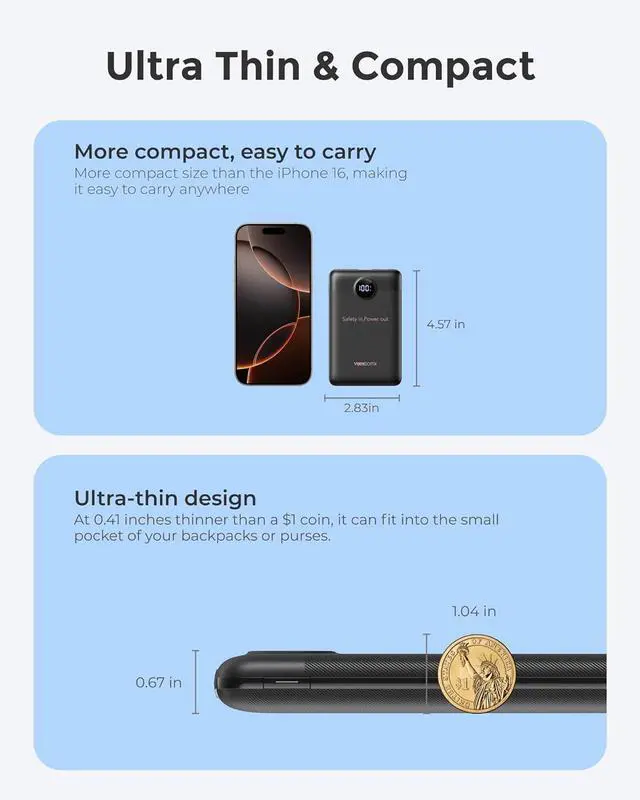 [Charge card phone charger]Experience unparalleled portability with the slimmest and smallest portable charger, Weighing only 0.363 lb (165g), Slip it into your pocket effortlessly for on-the-go convenience