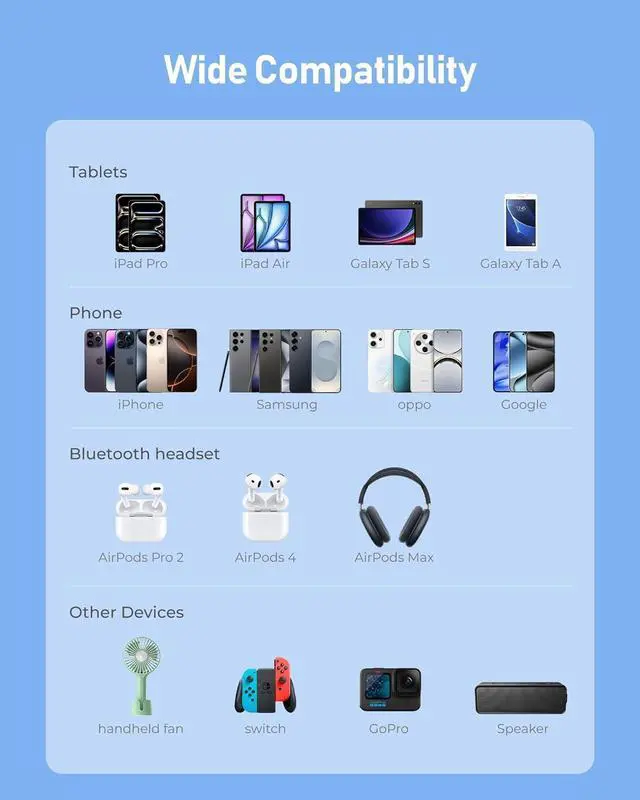 [Universal compatible with All popular devices]This portable phone charger is a one-stop solution with built-in ports and multi cables, making it universally compatible with popular smart devices.