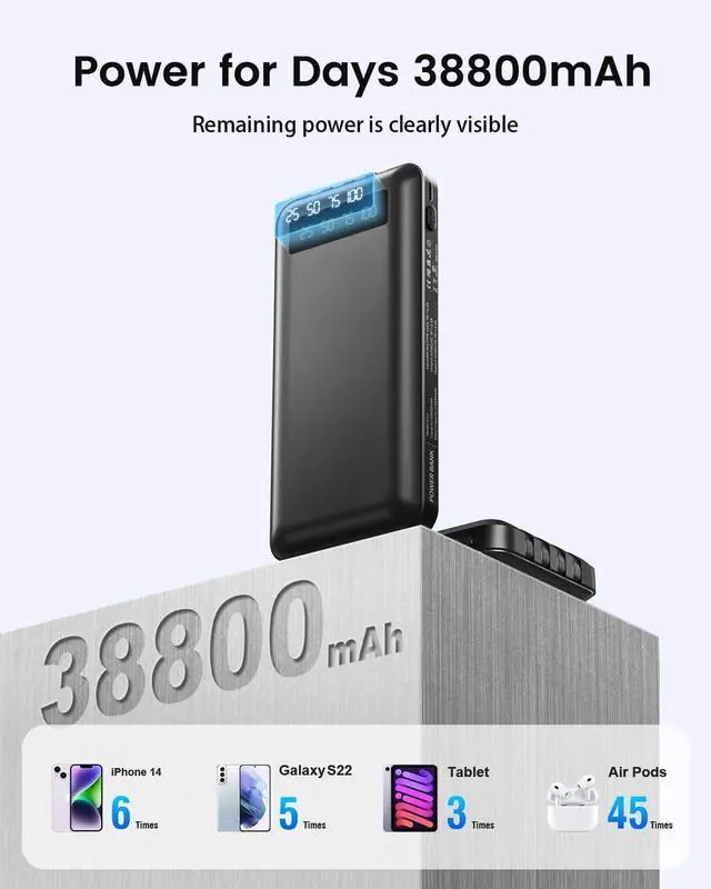 Huge 38800mAh Capacity Long-Lasting Powerthis high-capacity portable charger delivers days of reliable energy for iPhone 16/15/14/13 series, Samsung, Google Pixel, and more. This cell phone power bank is ideal for long trips, camping, and business travel. Say goodbye to battery anxiety and stay connected anytime, even during power outages or emergencies.