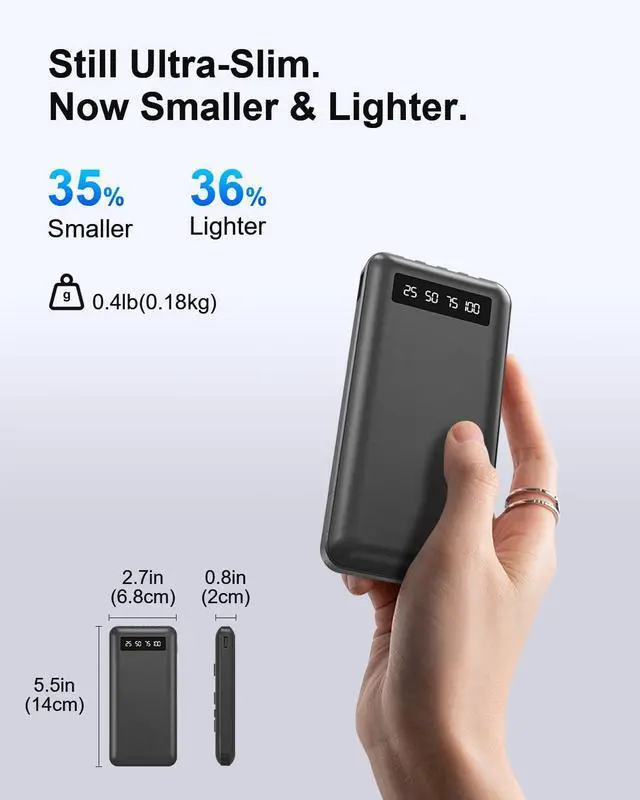 Super-slim, lightweight, and compact Weighing only 0.4 lb, this mini and slim power bank fits easily in your pocket or palm, making it ideal for travel, kids, or use as a backup device
