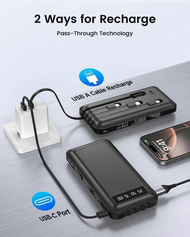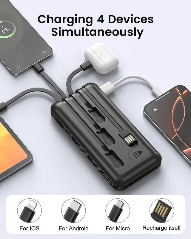 4 Outputs & 2 InputsThis rush 3 in 1 portable charger power bank features 4 built-in cables (3 output + 1 input), allowing you to charge up to 4 devices simultaneously without extra cords. Compatible with iPhone, iPad, Samsung, tablets, smartwatches, and more. With dual input options, it' s perfect for daily commutes or travel. Compact and portable, one device covers all your charging needs