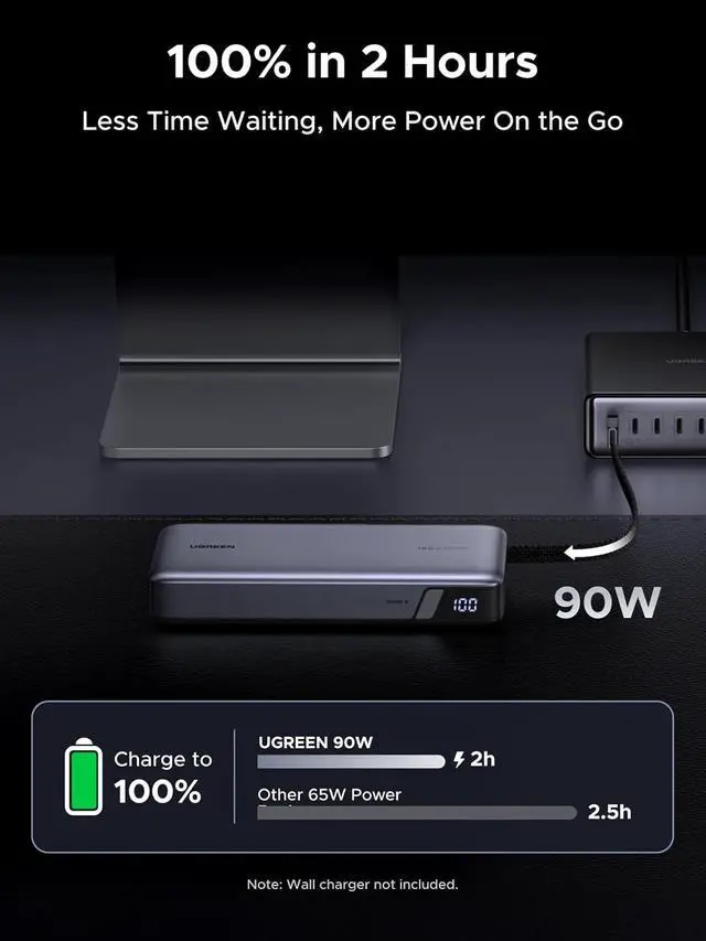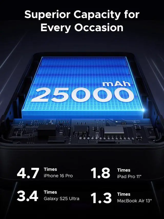 90W Fast Recharging Fully Ready in About 2 Hours: With 90W input, this power bank quickly restores its 25, 000mAh capacity in roughly 2 hoursperfect for short layovers, coffee breaks, or overnight recharges. Youll always have reliable power ready before the next task begins.