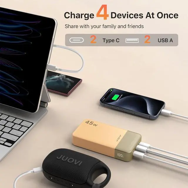 PD High-Speed Charging: JUOVI 45W High-Speed power bank has 45W fast charge and 30W rapid recharge technology. It only takes 30 minutes to charge your iPhone 15 pro from 0% to 60%, which is 3-4 times faster than most ordinary 10W old power banks on the market