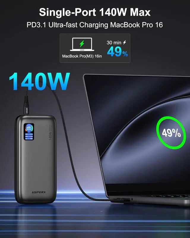 [Universal Compatibility]: The AsperX 140W power bank is compatible with a wide range of devices and supports the most common fast charging protocols, including PD 3.0, QC 3.0, PPS, AFC, and UFCS. It allows you to quickly charge your phone, laptop, tablet, game console, and camera.