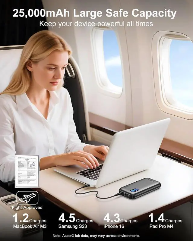 000mAh Capacity - Flight-Approved]: This 25, 000mAh power bank features a high-capacity battery of up to 92.5W h, meeting the U. S. Transportation Security Administration (TSA) requirement ( <100Wh) for safe carry-on use. All-day battery life: Charges your laptop, phone, and devices for over 24 hours, perfect for work, hiking, camping, long flights, or as an emergency power source during home power outages. It can charge a MacBook Pro 1.3 times and an iPhone 16 4.5 times