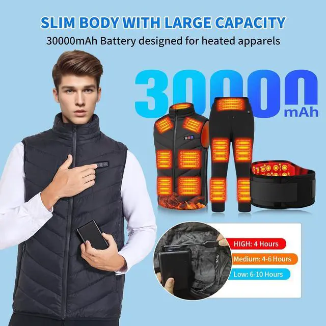 Professional Heated Vest Battery Pack30000mAh large-capacity battery pack for heated vest. The heated vest battery pack replacement has pocket size, ultra-compact, ultra-portable. It is handy and easy to put the battery for heated vest in your pocket or handbag.