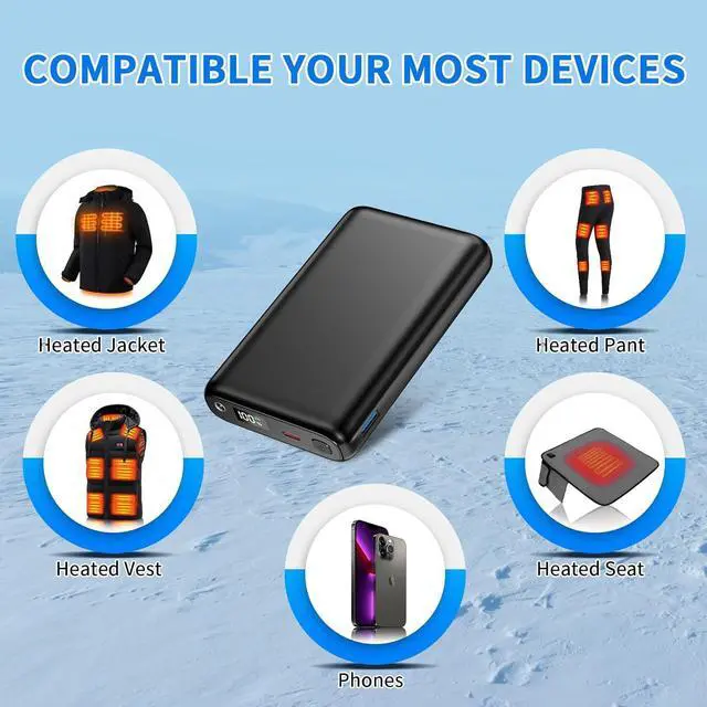 Perfect Spare Battery for Heated ClothingCompatible with most heated devices (heated jackets, vests, and pants) on the market, with seamless battery replacement, it can be taken as an additional battery pack, which enables you to enjoy more time outdoors and keeps you warm at any time.