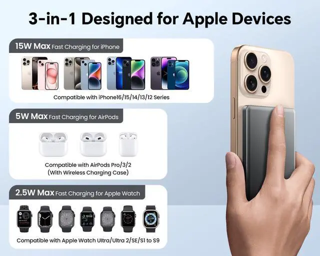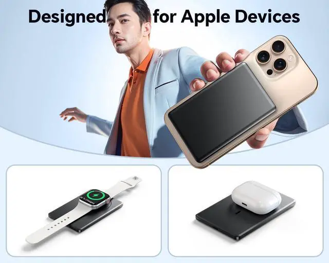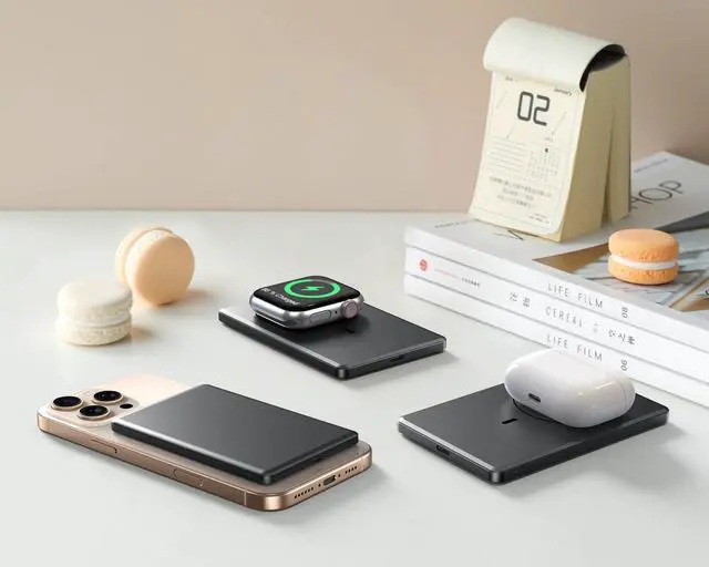 15W Fast Wireless & PD 22.5W Wired Charging-Magnetic power bank supports 15W Max wireless charging for smart phone(for iPhone 12-15 series support 7.5W Max wireless charging), 5W Max wireless charging for Airpods 2/Airpods 3rd Gen/Airpods Pro/Airpods Pro 2nd Gen; 3W Max Wireless Charging for Apple Watch series (Ultra/8/7/6/SE/5/4/3/2/1). Type-C port supports 22.5W Max fast input/output charging