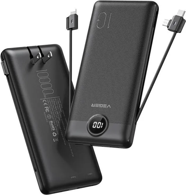 Portable Charger with Built in Cables &Plug VEGER 10000mAh Portable Charger, with built-in USB-C, other cable for iPhone, and a Wall Plug for recharging the power bank itself, you can say goodbye to carrying adapters and cables when travel.